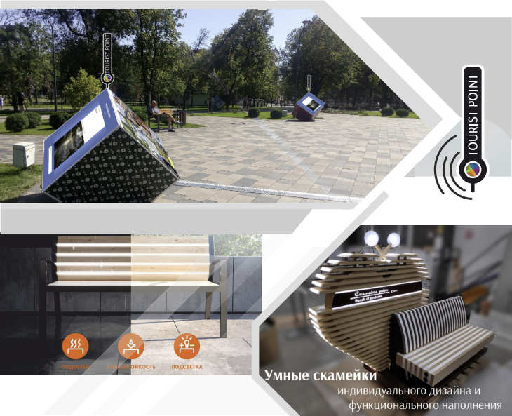 Это может быть реализовано как оформленная зона отдыха с очень широким спектром возможностей от скамеек с зарядками, освещением и подогревом до умных конструкций с тревожной кнопкой, видеослежением, графической панелью и многим другим, либо это могут быть отдельные заметные малые конструкции, либо просто знак точки притяжения с оборудованием Wi-Fi.